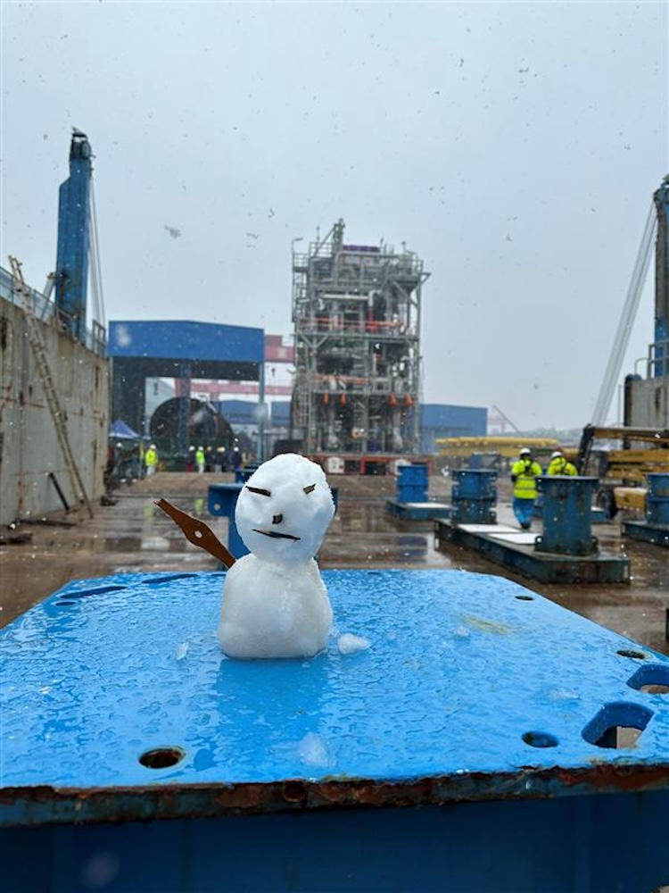 The team in China welcomed the MV Rolldock Storm in Chinese waters last week. The MV Rolldock Storm is an innovative, highly adaptable transport vessels that combines semi-submersible, heavy lift and RORO capabilities. The vessel was in China to load nine modules using her heavy-lift capabilities and one module using her unique heavy RORO capabilities. The team assisted with her port call to load the units and offered local support (including the making of a snowman!). We want to thank the all parties involved for making this a smooth operation, despite heavy winds and snow, and look forward to receiving her in Chinese waters again soon!